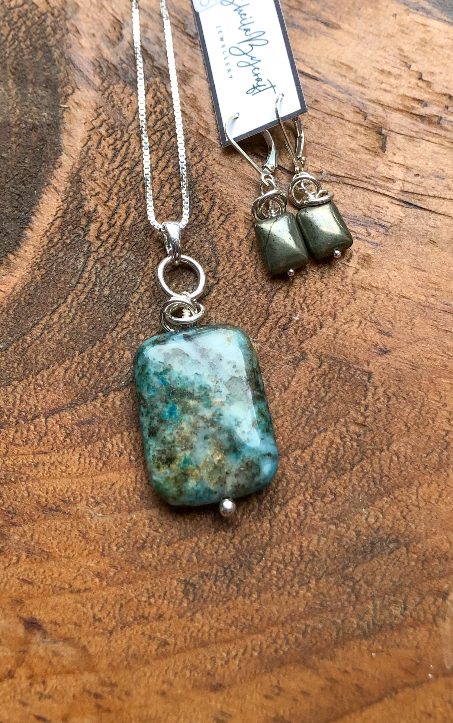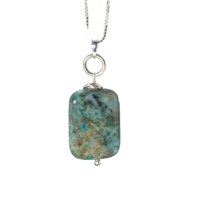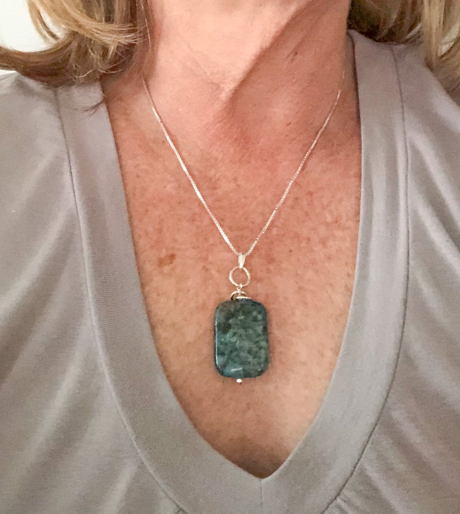 Such a cool stone with lots of colour variation! This statement pendant with sterling accents is suspended from an Italian box link chain. This little number is sure to be noticed!