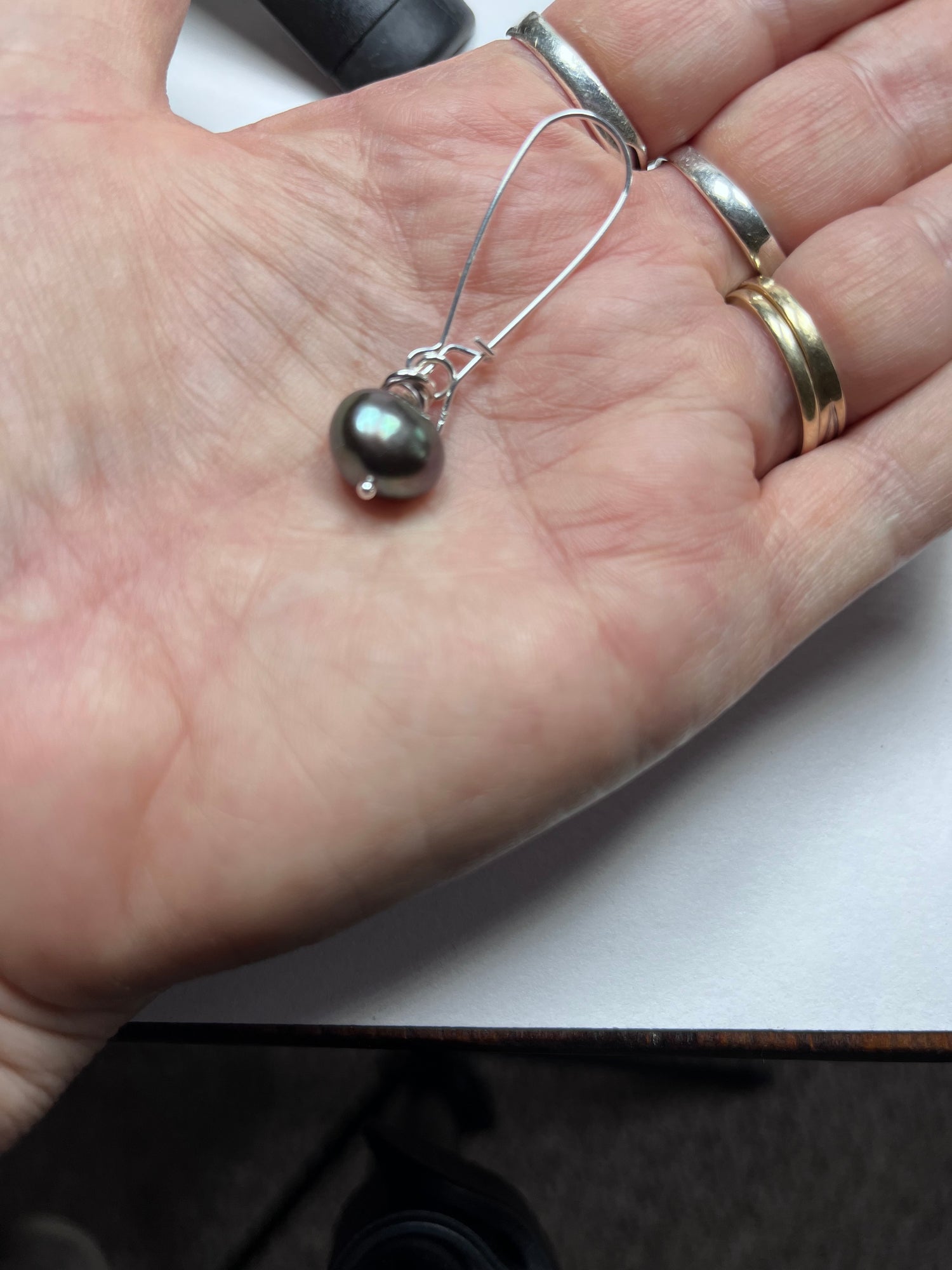 Amazing iridescent freshwater black pearls suspended by long sterling ear wires and topped with a sterling twist!