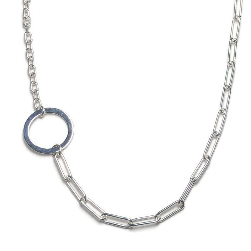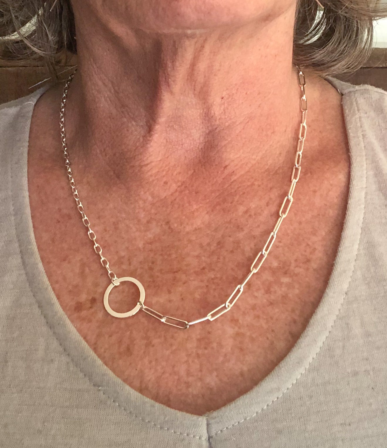 A mix of square cable chain, paperclip chain and a flat sterling circle make up this versatile offset sterling silver necklace.