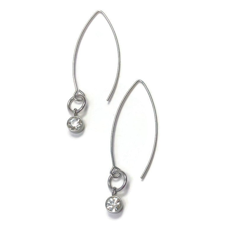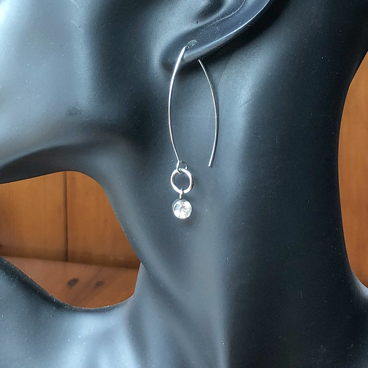 "Add some edge to your style with these long, modern earrings. The curved earwire adds a unique touch, while the stainless steel and crystal materials bring a touch of elegance. Perfect for adding a touch of sass to any outfit. (Warning: may cause compliments.)"